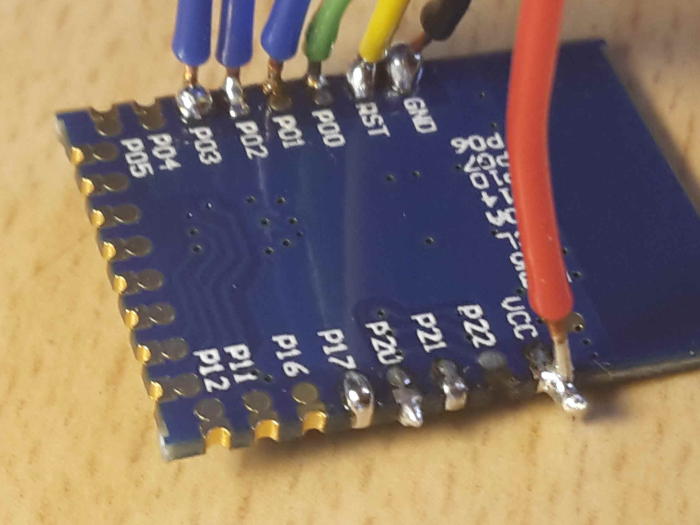 I soldered a few wires to the bare module. In particular you need to solder VCC, GND, P02 and P03. This is not exactly the best soldering I ever did, and I wouldn't recommend it as I broke one of the connections (P22, which is crucial for flashing a new firmware on it). There is a tutorial on how to solder it properly over here that I haven't fully watched but it seems good.