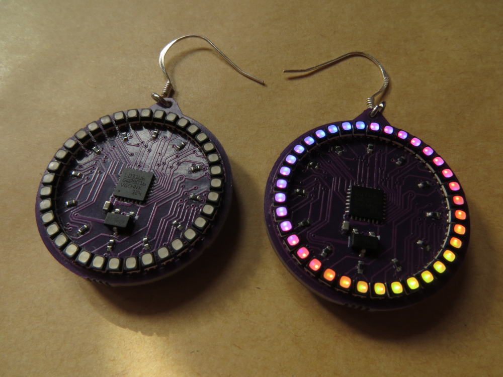 I've made new and improved RGB LED earrings, with double the LEDs compared to my previous LED earrings. They also have some other improvements: they're more power efficient and the LEDs just look a lot better.
